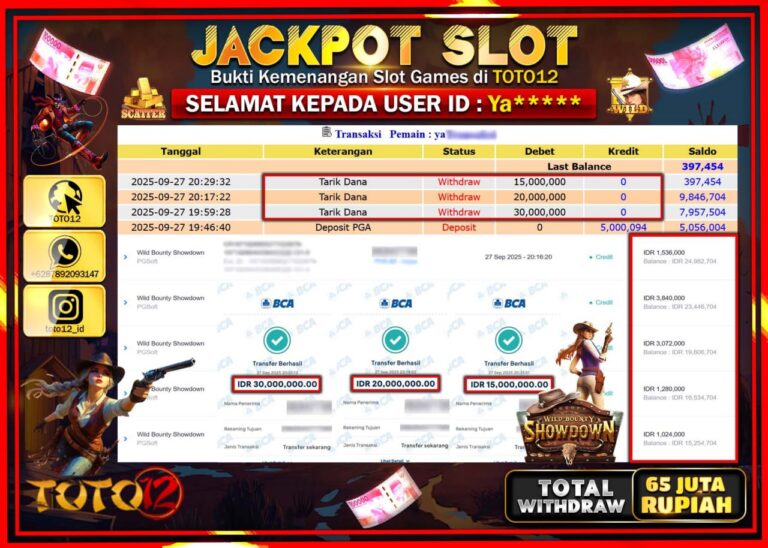 Selamat kepada Member Kami Ya****** Telah Jackpot dan berhasil mendapatkan kemenangan besar pada permainan JACKPOT SLOT GAME (WILD BOUNTY SHOWDOWN) Dengan Kemenangan Sebesar Rp.65.000.000 –. Setelah mengisi Fomulir Withdraw dengan Kurang waktu 1-2 Menit Dana sudah kami Trasnfer kepada Pemilik Userid dan dana sudah dapat di cairkan oleh pemenang. Bukti Pembayaran yang TOTO12 berikan merupakan Bukti…