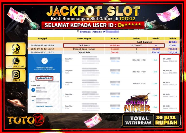 Selamat kepada Member Kami Dv****** Telah Jackpot dan berhasil mendapatkan kemenangan besar pada permainan JACKPOT SLOT GAME (GALAXY MINER) Dengan Kemenangan Sebesar Rp.20.000.000 –. Setelah mengisi Fomulir Withdraw dengan Kurang waktu 1-2 Menit Dana sudah kami Trasnfer kepada Pemilik Userid dan dana sudah dapat di cairkan oleh pemenang. Bukti Pembayaran yang TOTO12 berikan merupakan Bukti Pembayaran…