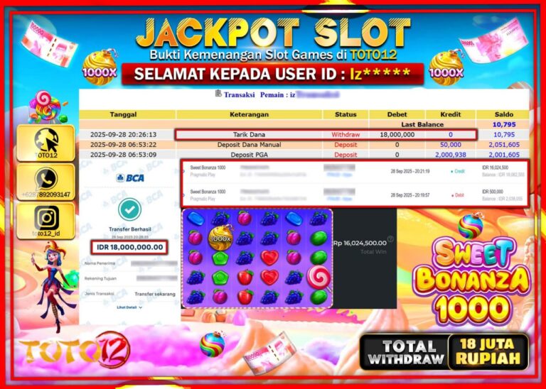 Selamat kepada Member Kami Iz****** Telah Jackpot dan berhasil mendapatkan kemenangan besar pada permainan JACKPOT SLOT GAME (SWEET BONANZA 1000) Dengan Kemenangan Sebesar Rp.18.000.000 –. Setelah mengisi Fomulir Withdraw dengan Kurang waktu 1-2 Menit Dana sudah kami Trasnfer kepada Pemilik Userid dan dana sudah dapat di cairkan oleh pemenang. Bukti Pembayaran yang TOTO12 berikan merupakan Bukti…