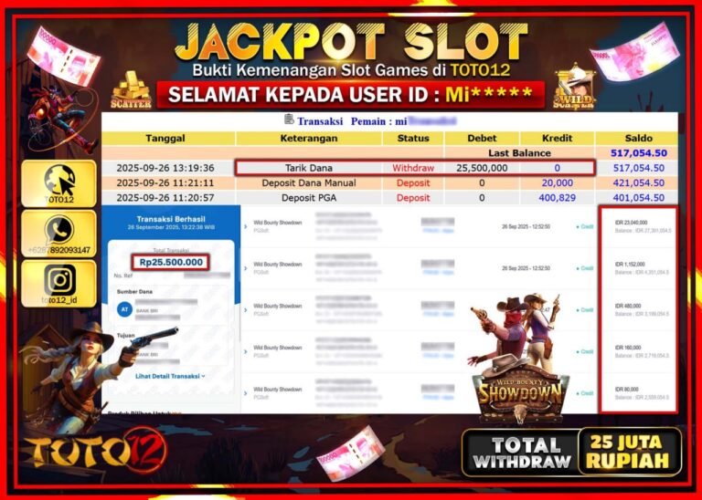 Selamat kepada Member Kami Mi****** Telah Jackpot dan berhasil mendapatkan kemenangan besar pada permainan JACKPOT SLOT GAME (WILD BOUNTY SHOWDOWN) Dengan Kemenangan Sebesar Rp.25.500.000 –. Setelah mengisi Fomulir Withdraw dengan Kurang waktu 1-2 Menit Dana sudah kami Trasnfer kepada Pemilik Userid dan dana sudah dapat di cairkan oleh pemenang. Bukti Pembayaran yang TOTO12 berikan merupakan Bukti…