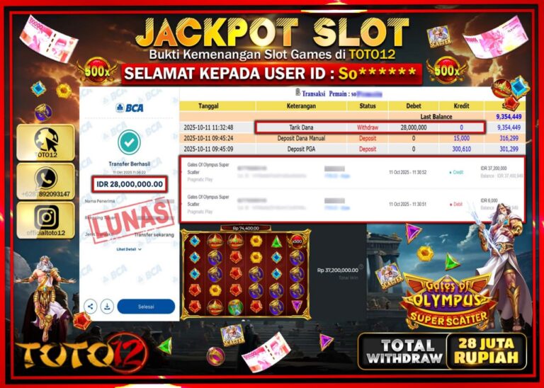 Selamat kepada Member Kami So****** Telah Jackpot dan berhasil mendapatkan kemenangan besar pada permainan JACKPOT SLOT GAME (GATES OF OLYMPUS SUPER SCATTER) Dengan Kemenangan Sebesar Rp.28.000.000 –. Setelah mengisi Fomulir Withdraw dengan Kurang waktu 1-2 Menit Dana sudah kami Trasnfer kepada Pemilik Userid dan dana sudah dapat di cairkan oleh pemenang. Bukti Pembayaran yang TOTO12 berikan…