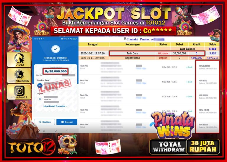 Selamat kepada Member Kami Co****** Telah Jackpot dan berhasil mendapatkan kemenangan besar pada permainan JACKPOT SLOT GAME (PINATA WINS) Dengan Kemenangan Sebesar Rp.38.000.000 –. Setelah mengisi Fomulir Withdraw dengan Kurang waktu 1-2 Menit Dana sudah kami Trasnfer kepada Pemilik Userid dan dana sudah dapat di cairkan oleh pemenang. Bukti Pembayaran yang TOTO12 berikan merupakan Bukti Pembayaran…