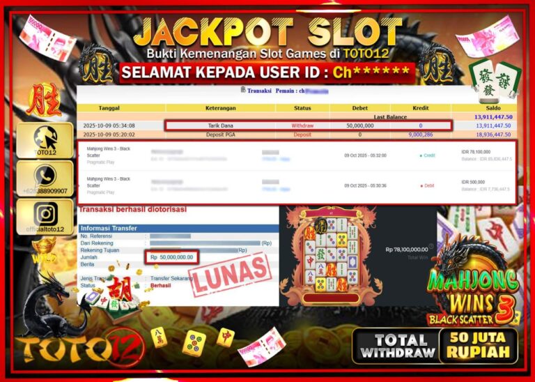 Selamat kepada Member Kami Ch****** Telah Jackpot dan berhasil mendapatkan kemenangan besar pada permainan JACKPOT SLOT GAME (MAHJONG WINS 3 BLACK SCATTER) Dengan Kemenangan Sebesar Rp.50.000.000 –. Setelah mengisi Fomulir Withdraw dengan Kurang waktu 1-2 Menit Dana sudah kami Trasnfer kepada Pemilik Userid dan dana sudah dapat di cairkan oleh pemenang. Bukti Pembayaran yang TOTO12 berikan…