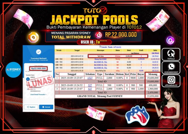 Selamat kepada Member Kami To****** Telah Jackpot dan berhasil mendapatkan kemenangan besar pada permainan JACKPOT POOLS PASARAN (SYDNEY) Dengan Kemenangan Sebesar Rp.22.000.000 –. Setelah mengisi Fomulir Withdraw dengan Kurang waktu 1-2 Menit Dana sudah kami Trasnfer kepada Pemilik Userid dan dana sudah dapat di cairkan oleh pemenang. Bukti Pembayaran yang TOTO12 berikan merupakan Bukti Pembayaran yang …