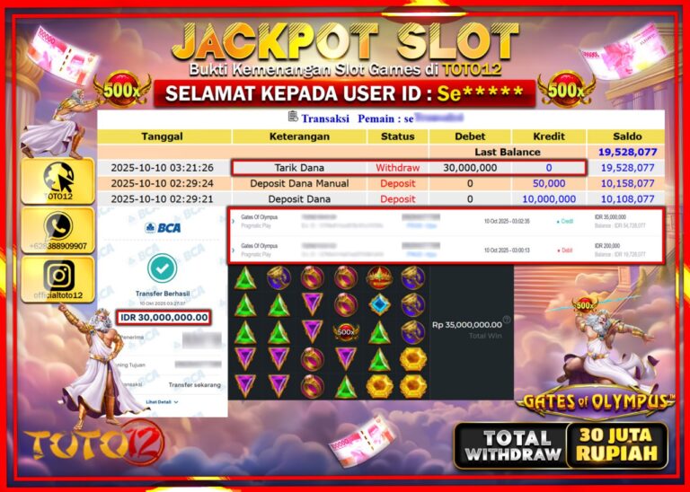 Selamat kepada Member Kami Se****** Telah Jackpot dan berhasil mendapatkan kemenangan besar pada permainan JACKPOT SLOT GAME (GATES OF OLYMPUS) Dengan Kemenangan Sebesar Rp.30.000.000 –. Setelah mengisi Fomulir Withdraw dengan Kurang waktu 1-2 Menit Dana sudah kami Trasnfer kepada Pemilik Userid dan dana sudah dapat di cairkan oleh pemenang. Bukti Pembayaran yang TOTO12 berikan merupakan Bukti…