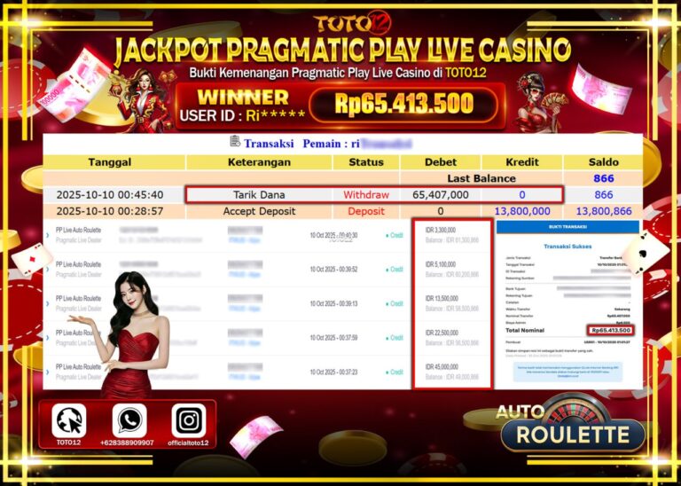 HANYA DI TOTO12 JP PASTI DI BAYAR LUNAS DAN CEPAT!!!!!! JACKPOT PRAGMATIC PLAY LIVE CASINO (AUTO ROULETTE) Rp.65.407.000 !!!!