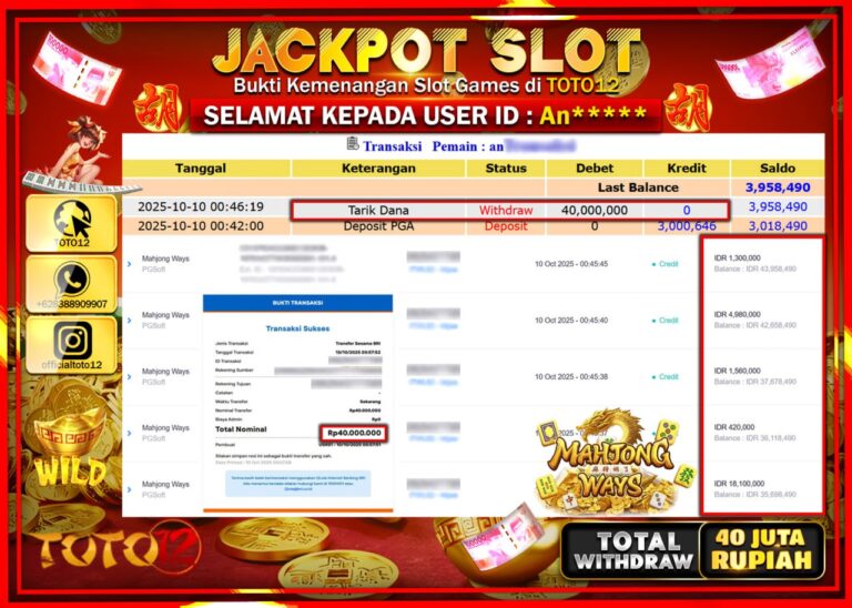 Selamat kepada Member Kami An****** Telah Jackpot dan berhasil mendapatkan kemenangan besar pada permainan JACKPOT SLOT GAME (MAHJONG WAYS) Dengan Kemenangan Sebesar Rp.40.000.000 –. Setelah mengisi Fomulir Withdraw dengan Kurang waktu 1-2 Menit Dana sudah kami Trasnfer kepada Pemilik Userid dan dana sudah dapat di cairkan oleh pemenang. Bukti Pembayaran yang TOTO12 berikan merupakan Bukti Pembayaran…