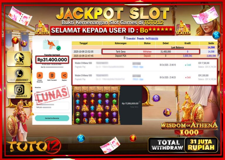 Selamat kepada Member Kami Bo****** Telah Jackpot dan berhasil mendapatkan kemenangan besar pada permainan JACKPOT SLOT GAME (WISDOM OF ATHENA 1000) Dengan Kemenangan Sebesar Rp.31.400.000 –. Setelah mengisi Fomulir Withdraw dengan Kurang waktu 1-2 Menit Dana sudah kami Trasnfer kepada Pemilik Userid dan dana sudah dapat di cairkan oleh pemenang. Bukti Pembayaran yang TOTO12 berikan merupakan…