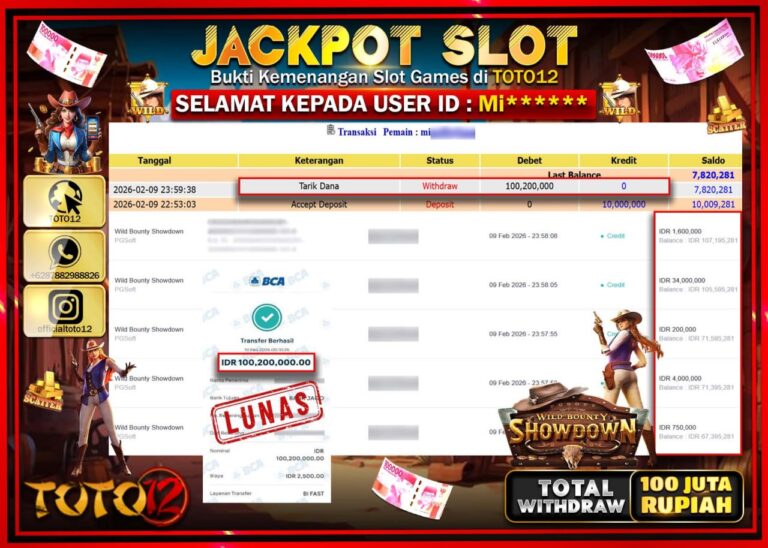 Selamat kepada Member Kami Mi***** Telah Jackpot dan berhasil mendapatkan kemenangan besar pada permainan JACKPOT SLOT GAME (WILD BOUNTY SHOWDOWN ) Dengan Kemenangan Sebesar Rp.100.200.000–. Setelah mengisi Fomulir Withdraw dengan Kurang waktu 1-2 Menit Dana sudah kami Trasnfer kepada Pemilik Userid dan dana sudah dapat di cairkan oleh pemenang. Bukti Pembayaran yang TOTO12 berikan merupakan Bukti…