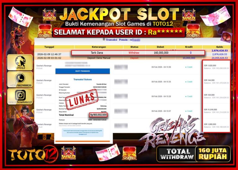 Selamat kepada Member Kami Ra***** Telah Jackpot dan berhasil mendapatkan kemenangan besar pada permainan JACKPOT SLOT GAME (GEISHAS REVENGE) Dengan Kemenangan Sebesar Rp.160.000.000–. Setelah mengisi Fomulir Withdraw dengan Kurang waktu 1-2 Menit Dana sudah kami Trasnfer kepada Pemilik Userid dan dana sudah dapat di cairkan oleh pemenang. Bukti Pembayaran yang TOTO12 berikan merupakan Bukti Pembayaran yang SAH…