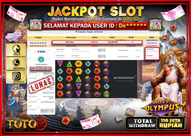 Selamat kepada Member Kami De***** Telah Jackpot dan berhasil mendapatkan kemenangan besar pada permainan JACKPOT SLOT GAME (GATES OF OLYMPUS ) Dengan Kemenangan Sebesar Rp.110.000.000–. Setelah mengisi Fomulir Withdraw dengan Kurang waktu 1-2 Menit Dana sudah kami Trasnfer kepada Pemilik Userid dan dana sudah dapat di cairkan oleh pemenang. Bukti Pembayaran yang TOTO12 berikan merupakan Bukti…