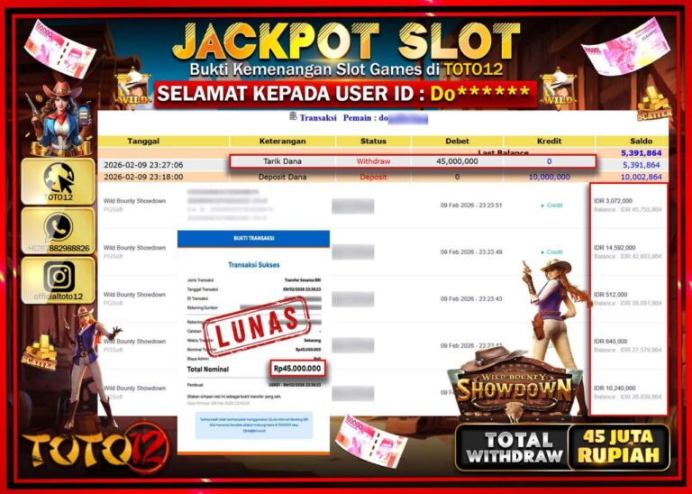 Selamat kepada Member Kami Do***** Telah Jackpot dan berhasil mendapatkan kemenangan besar pada permainan JACKPOT SLOT GAME (WILD BOUNTY SHOWDOWN ) Dengan Kemenangan Sebesar Rp.45.000.000–. Setelah mengisi Fomulir Withdraw dengan Kurang waktu 1-2 Menit Dana sudah kami Trasnfer kepada Pemilik Userid dan dana sudah dapat di cairkan oleh pemenang. Bukti Pembayaran yang TOTO12 berikan merupakan Bukti…