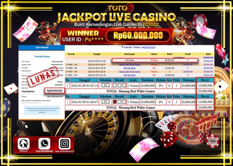 Selamat kepada Member Kami Pu***** Telah Jackpot dan berhasil mendapatkan kemenangan besar pada permainan JACKPOT LIVE GAME CASINO (RED WHITE) Dengan Kemenangan Sebesar Rp.60.000.000–. Setelah mengisi Fomulir Withdraw dengan Kurang waktu 1-2 Menit Dana sudah kami Trasnfer kepada Pemilik Userid dan dana sudah dapat di cairkan oleh pemenang. Bukti Pembayaran yang TOTO12 berikan merupakan Bukti Pembayaran…