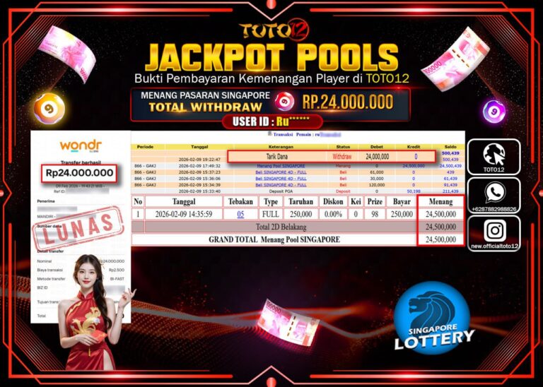 Selamat kepada Member Kami Ru***** Telah Jackpot dan berhasil mendapatkan kemenangan besar pada permainan JACKPOT POOLS PASARAN (SINGAPORE) Dengan Kemenangan Sebesar Rp.24.000.000–. Setelah mengisi Fomulir Withdraw dengan Kurang waktu 1-2 Menit Dana sudah kami Trasnfer kepada Pemilik Userid dan dana sudah dapat di cairkan oleh pemenang. Bukti Pembayaran yang TOTO12 berikan merupakan Bukti Pembayaran yang SAH /…