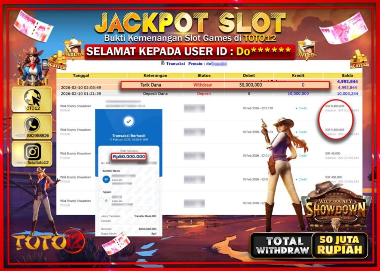 Selamat kepada Member Kami Do***** Telah Jackpot dan berhasil mendapatkan kemenangan besar pada permainan JACKPOT SLOT GAME (WILD BOUNTY SHOWDOWN ) Dengan Kemenangan Sebesar Rp.50.000.000–. Setelah mengisi Fomulir Withdraw dengan Kurang waktu 1-2 Menit Dana sudah kami Trasnfer kepada Pemilik Userid dan dana sudah dapat di cairkan oleh pemenang. Bukti Pembayaran yang TOTO12 berikan merupakan Bukti…