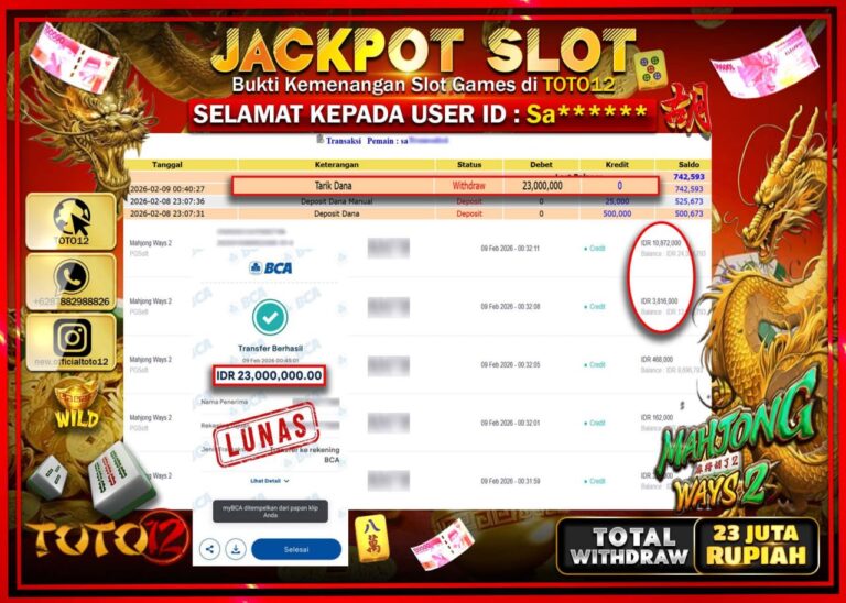 Selamat kepada Member Kami Sa***** Telah Jackpot dan berhasil mendapatkan kemenangan besar pada permainan JACKPOT SLOT GAME (MAHJONG WAYS 2) Dengan Kemenangan Sebesar Rp.23.000.000–. Setelah mengisi Fomulir Withdraw dengan Kurang waktu 1-2 Menit Dana sudah kami Trasnfer kepada Pemilik Userid dan dana sudah dapat di cairkan oleh pemenang. Bukti Pembayaran yang TOTO12 berikan merupakan Bukti Pembayaran…