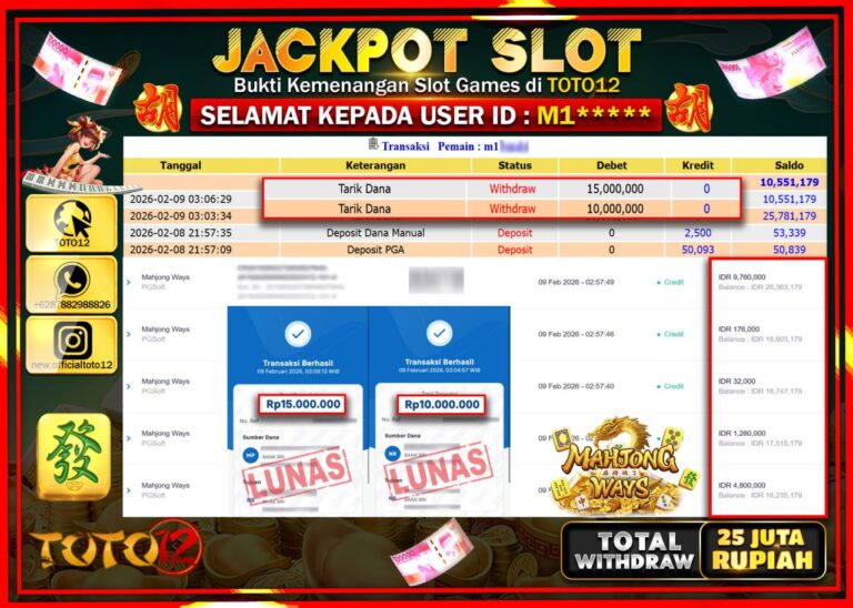 Selamat kepada Member Kami M1***** Telah Jackpot dan berhasil mendapatkan kemenangan besar pada permainan JACKPOT SLOT GAME (MAHJONG WAYS) Dengan Kemenangan Sebesar Rp.25.000.000–. Setelah mengisi Fomulir Withdraw dengan Kurang waktu 1-2 Menit Dana sudah kami Trasnfer kepada Pemilik Userid dan dana sudah dapat di cairkan oleh pemenang. Bukti Pembayaran yang TOTO12 berikan merupakan Bukti Pembayaran yang SAH…