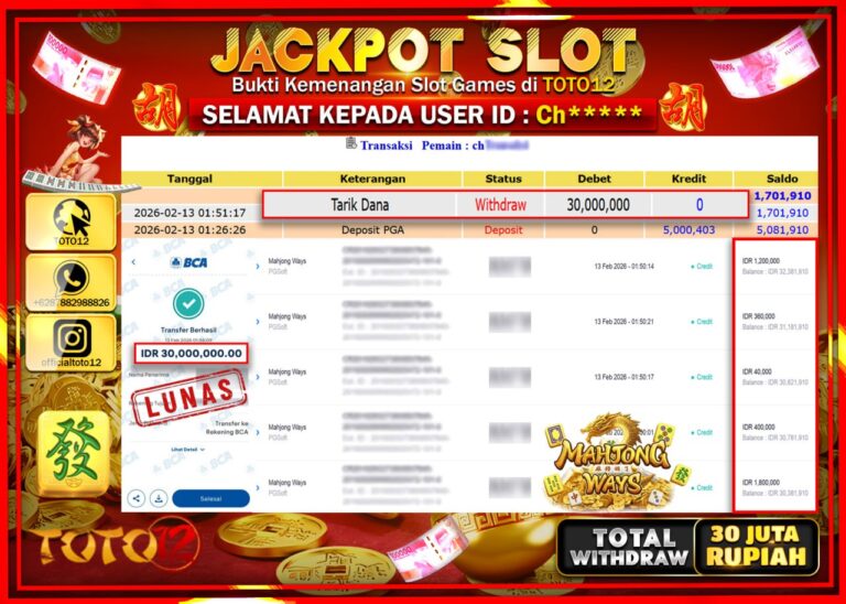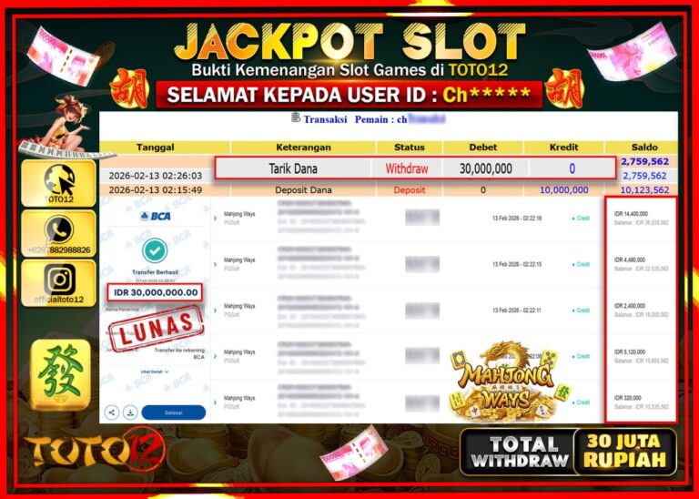Selamat kepada Member Kami Ch***** Telah Jackpot dan berhasil mendapatkan kemenangan besar pada permainan JACKPOT SLOT GAME (MAHJONG WAYS) Dengan Kemenangan Sebesar Rp.30.000.000–. Setelah mengisi Fomulir Withdraw dengan Kurang waktu 1-2 Menit Dana sudah kami Trasnfer kepada Pemilik Userid dan dana sudah dapat di cairkan oleh pemenang. Bukti Pembayaran yang TOTO12 berikan merupakan Bukti Pembayaran yang SAH…