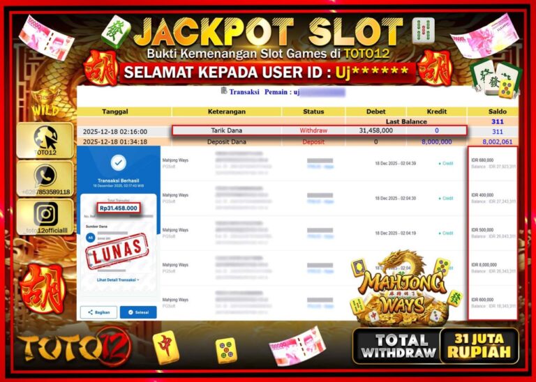 Selamat kepada Member Kami Uj****** Telah Jackpot dan berhasil mendapatkan kemenangan besar pada permainan JACKPOT SLOT GAME (MAHJONG WAYS) Dengan Kemenangan Sebesar Rp.31.458.000 –. Setelah mengisi Fomulir Withdraw dengan Kurang waktu 1-2 Menit Dana sudah kami Trasnfer kepada Pemilik Userid dan dana sudah dapat di cairkan oleh pemenang. Bukti Pembayaran yang TOTO12 berikan merupakan Bukti Pembayaran…