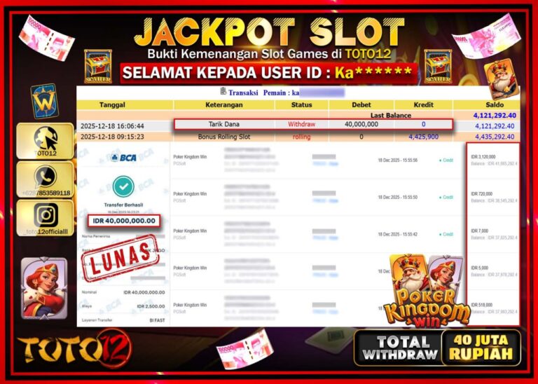 Selamat kepada Member Kami Ka****** Telah Jackpot dan berhasil mendapatkan kemenangan besar pada permainan JACKPOT SLOT GAME (POKER KINGDOM WIN) Dengan Kemenangan Sebesar Rp.40.000.000 –. Setelah mengisi Fomulir Withdraw dengan Kurang waktu 1-2 Menit Dana sudah kami Trasnfer kepada Pemilik Userid dan dana sudah dapat di cairkan oleh pemenang. Bukti Pembayaran yang TOTO12 berikan merupakan Bukti…