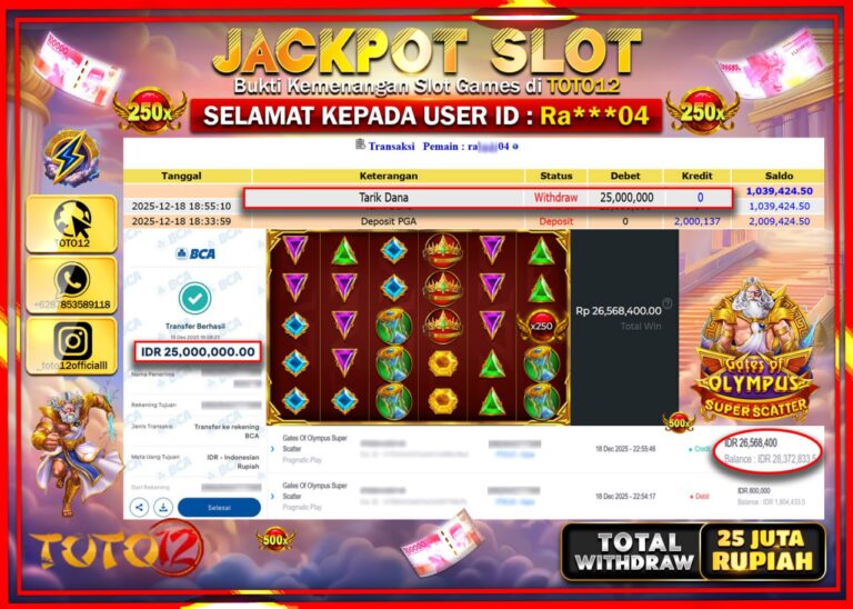 Selamat kepada Member Kami Ra****** Telah Jackpot dan berhasil mendapatkan kemenangan besar pada permainan JACKPOT SLOT GAME (GATES OF OLYMPUS SUPER SACTTER) Dengan Kemenangan Sebesar Rp.25.000.000 –. Setelah mengisi Fomulir Withdraw dengan Kurang waktu 1-2 Menit Dana sudah kami Trasnfer kepada Pemilik Userid dan dana sudah dapat di cairkan oleh pemenang. Bukti Pembayaran yang TOTO12 berikan…