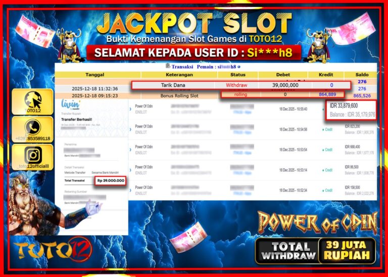 Selamat kepada Member Kami Si****** Telah Jackpot dan berhasil mendapatkan kemenangan besar pada permainan JACKPOT SLOT GAME (POWER OF ODIN) Dengan Kemenangan Sebesar Rp.39.000.000 –. Setelah mengisi Fomulir Withdraw dengan Kurang waktu 1-2 Menit Dana sudah kami Trasnfer kepada Pemilik Userid dan dana sudah dapat di cairkan oleh pemenang. Bukti Pembayaran yang TOTO12 berikan merupakan Bukti…