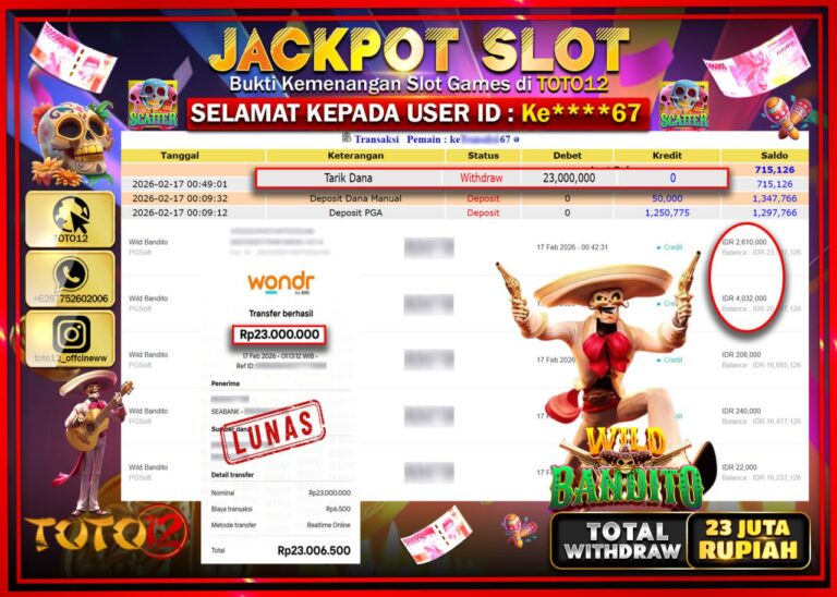 Selamat kepada Member Kami Ke******67 Telah Jackpot dan berhasil mendapatkan kemenangan besar pada permainan JACKPOT SLOT GAME (WILD BANDITO) Dengan Kemenangan Sebesar Rp.23.000.000–. Setelah mengisi Fomulir Withdraw dengan Kurang waktu 1-2 Menit Dana sudah kami Trasnfer kepada Pemilik Userid dan dana sudah dapat di cairkan oleh pemenang. Bukti Pembayaran yang TOTO12 berikan merupakan Bukti Pembayaran yang SAH…