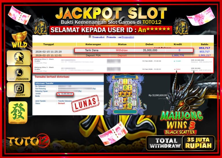 Selamat kepada Member Kami An****** Telah Jackpot dan berhasil mendapatkan kemenangan besar pada permainan JACKPOT SLOT GAME (MAHJONG WINS 3 BLACK SCATTER) Dengan Kemenangan Sebesar Rp.35.000.000–. Setelah mengisi Fomulir Withdraw dengan Kurang waktu 1-2 Menit Dana sudah kami Trasnfer kepada Pemilik Userid dan dana sudah dapat di cairkan oleh pemenang. Bukti Pembayaran yang TOTO12 berikan merupakan…