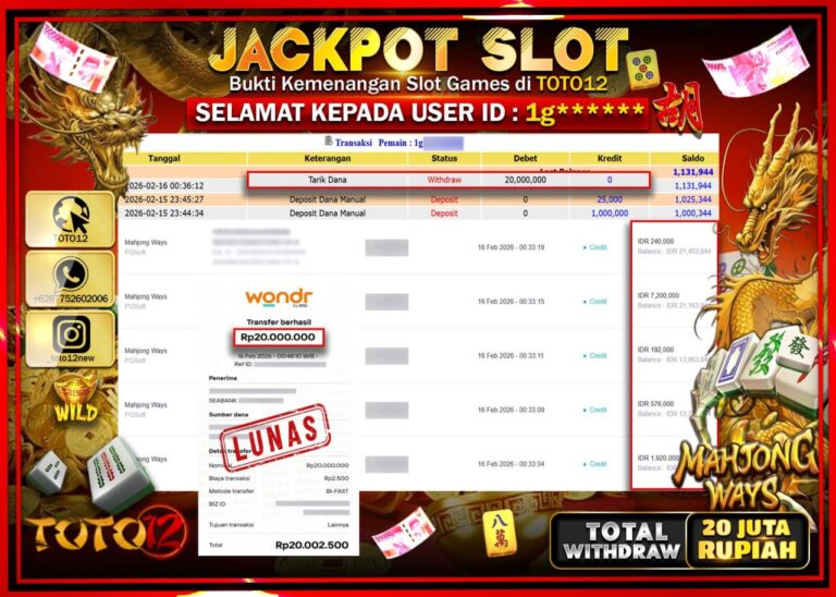 Selamat kepada Member Kami 1g****** Telah Jackpot dan berhasil mendapatkan kemenangan besar pada permainan JACKPOT SLOT GAME (MAHJONG WAYS) Dengan Kemenangan Sebesar Rp.20.000.000–. Setelah mengisi Fomulir Withdraw dengan Kurang waktu 1-2 Menit Dana sudah kami Trasnfer kepada Pemilik Userid dan dana sudah dapat di cairkan oleh pemenang. Bukti Pembayaran yang TOTO12 berikan merupakan Bukti Pembayaran yang SAH…