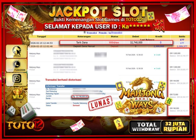 Selamat kepada Member Kami Ka****** Telah Jackpot dan berhasil mendapatkan kemenangan besar pada permainan JACKPOT SLOT GAME (MAHJONG WAYS) Dengan Kemenangan Sebesar Rp.32.748.000–. Setelah mengisi Fomulir Withdraw dengan Kurang waktu 1-2 Menit Dana sudah kami Trasnfer kepada Pemilik Userid dan dana sudah dapat di cairkan oleh pemenang. Bukti Pembayaran yang TOTO12 berikan merupakan Bukti Pembayaran yang SAH…
