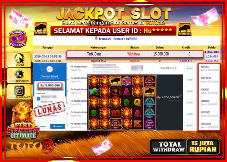 Selamat kepada Member Kami Hu****** Telah Jackpot dan berhasil mendapatkan kemenangan besar pada permainan JACKPOT SLOT GAME (FIRE STAMPEDE ULTIMATE) Dengan Kemenangan Sebesar Rp.15.000.000–. Setelah mengisi Fomulir Withdraw dengan Kurang waktu 1-2 Menit Dana sudah kami Trasnfer kepada Pemilik Userid dan dana sudah dapat di cairkan oleh pemenang. Bukti Pembayaran yang TOTO12 berikan merupakan Bukti Pembayaran…
