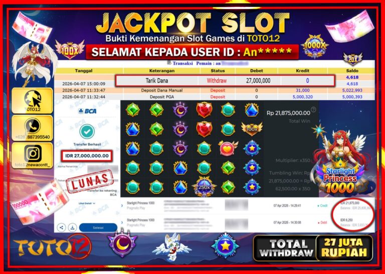 Selamat kepada Member Kami An***** Telah Jackpot dan berhasil mendapatkan kemenangan besar pada permainan JACKPOT SLOT GAME  (STARLIGHT PRINCESS 1000)  Dengan Kemenangan Sebesar Rp.27.000.000–. Setelah mengisi Fomulir Withdraw dengan Kurang waktu 1-2 Menit Dana sudah kami Trasnfer kepada Pemilik Userid dan dana sudah dapat di cairkan oleh pemenang. Bukti Pembayaran yang TOTO12 berikan merupakan Bukti Pembayaran…
