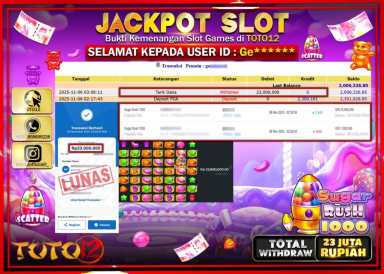 Selamat kepada Member Kami Ge****** Telah Jackpot dan berhasil mendapatkan kemenangan besar pada permainan JACKPOT SLOT GAME (SUGAR RUSH 1000) Dengan Kemenangan Sebesar Rp.23.000.000 –. Setelah mengisi Fomulir Withdraw dengan Kurang waktu 1-2 Menit Dana sudah kami Trasnfer kepada Pemilik Userid dan dana sudah dapat di cairkan oleh pemenang. Bukti Pembayaran yang TOTO12 berikan merupakan Bukti…