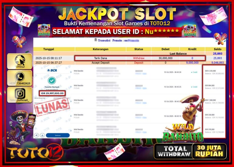 Selamat kepada Member Kami Nu****** Telah Jackpot dan berhasil mendapatkan kemenangan besar pada permainan JACKPOT SLOT GAME (WILD BANDITO) Dengan Kemenangan Sebesar Rp.30.000.000 –. Setelah mengisi Fomulir Withdraw dengan Kurang waktu 1-2 Menit Dana sudah kami Trasnfer kepada Pemilik Userid dan dana sudah dapat di cairkan oleh pemenang. Bukti Pembayaran yang TOTO12 berikan merupakan Bukti Pembayaran…