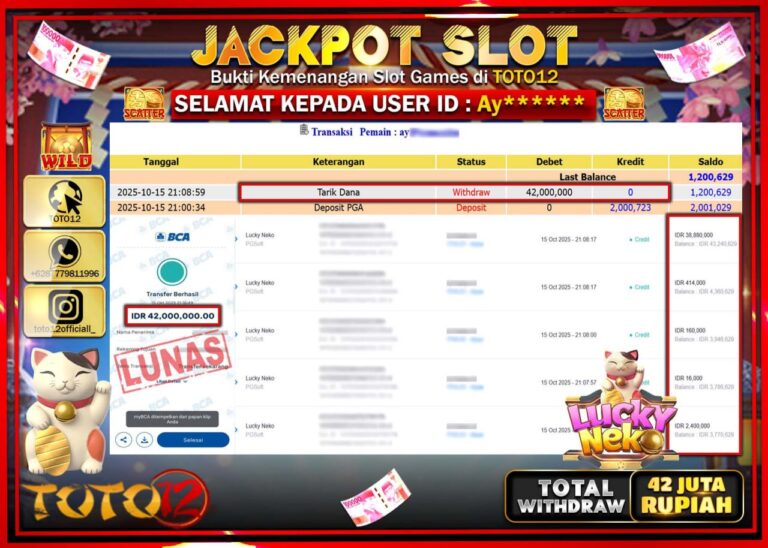 Selamat kepada Member Kami Ay****** Telah Jackpot dan berhasil mendapatkan kemenangan besar pada permainan JACKPOT SLOT GAME (LUCKY NEKO) Dengan Kemenangan Sebesar Rp.40.000.000 –. Setelah mengisi Fomulir Withdraw dengan Kurang waktu 1-2 Menit Dana sudah kami Trasnfer kepada Pemilik Userid dan dana sudah dapat di cairkan oleh pemenang. Bukti Pembayaran yang TOTO12 berikan merupakan Bukti Pembayaran…