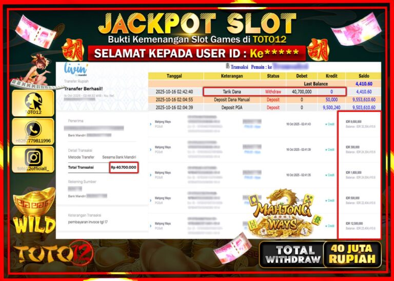 Selamat kepada Member Kami So****** Telah Jackpot dan berhasil mendapatkan kemenangan besar pada permainan JACKPOT SLOT GAME (MAHJONG WINS 2) Dengan Kemenangan Sebesar Rp.50.000.000 –. Setelah mengisi Fomulir Withdraw dengan Kurang waktu 1-2 Menit Dana sudah kami Trasnfer kepada Pemilik Userid dan dana sudah dapat di cairkan oleh pemenang. Bukti Pembayaran yang TOTO12 berikan merupakan Bukti…