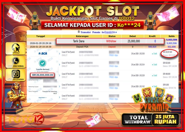 Selamat kepada Member Kami Ko****** Telah Jackpot dan berhasil mendapatkan kemenangan besar pada permainan JACKPOT SLOT GAME (CURSE OF THE PYRAMID) Dengan Kemenangan Sebesar Rp.25.000.000 –. Setelah mengisi Fomulir Withdraw dengan Kurang waktu 1-2 Menit Dana sudah kami Trasnfer kepada Pemilik Userid dan dana sudah dapat di cairkan oleh pemenang. Bukti Pembayaran yang TOTO12 berikan merupakan…