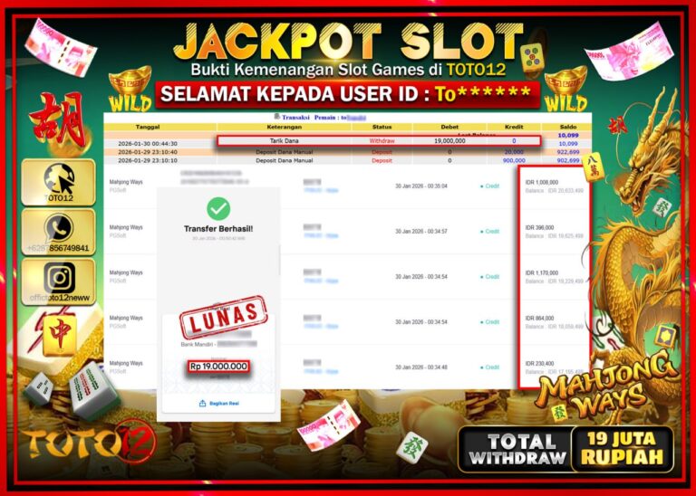 Selamat kepada Member Kami To****** Telah Jackpot dan berhasil mendapatkan kemenangan besar pada permainan JACKPOT SLOT GAME (MAHJONG WAYS) Dengan Kemenangan Sebesar Rp.19.000.000 –. Setelah mengisi Fomulir Withdraw dengan Kurang waktu 1-2 Menit Dana sudah kami Trasnfer kepada Pemilik Userid dan dana sudah dapat di cairkan oleh pemenang. Bukti Pembayaran yang TOTO12 berikan merupakan Bukti Pembayaran…