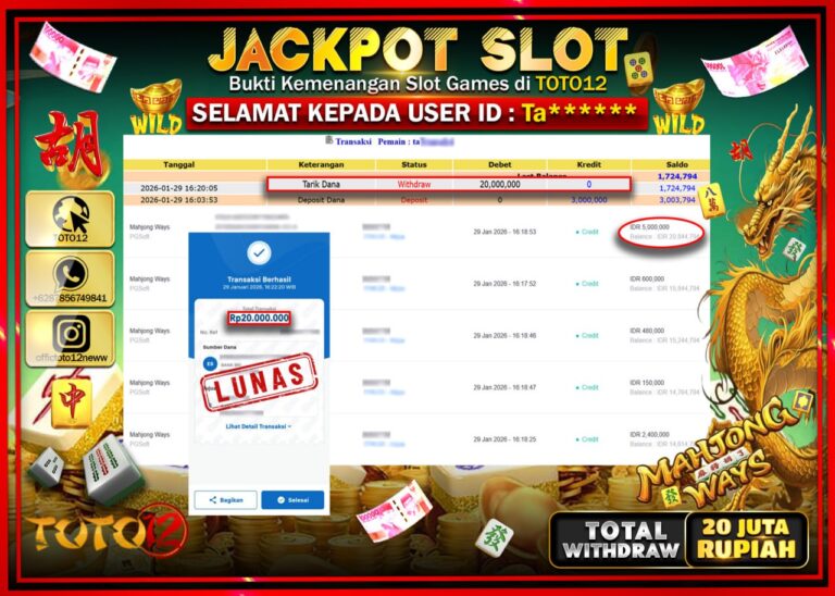 Selamat kepada Member Kami Ta****** Telah Jackpot dan berhasil mendapatkan kemenangan besar pada permainan JACKPOT SLOT GAME (MAHJONG WAYS) Dengan Kemenangan Sebesar Rp.20.000.000 –. Setelah mengisi Fomulir Withdraw dengan Kurang waktu 1-2 Menit Dana sudah kami Trasnfer kepada Pemilik Userid dan dana sudah dapat di cairkan oleh pemenang. Bukti Pembayaran yang TOTO12 berikan merupakan Bukti Pembayaran…