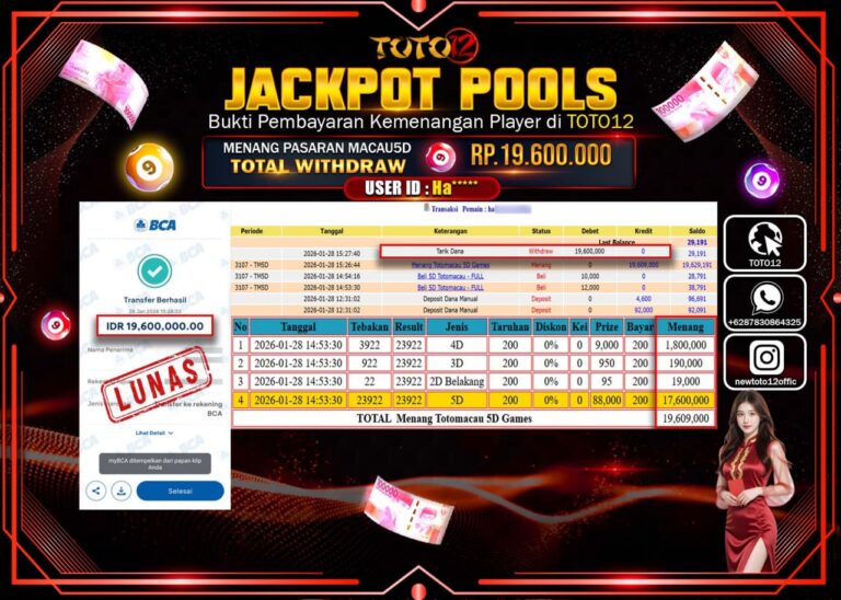 Selamat kepada Member Kami Ha****** Telah Jackpot dan berhasil mendapatkan kemenangan besar pada permainan JACKPOT POOLS PASARAN (5D GAMES) Dengan Kemenangan Sebesar Rp.19.600.000 –. Setelah mengisi Fomulir Withdraw dengan Kurang waktu 1-2 Menit Dana sudah kami Trasnfer kepada Pemilik Userid dan dana sudah dapat di cairkan oleh pemenang. Bukti Pembayaran yang TOTO12 berikan merupakan Bukti Pembayaran…