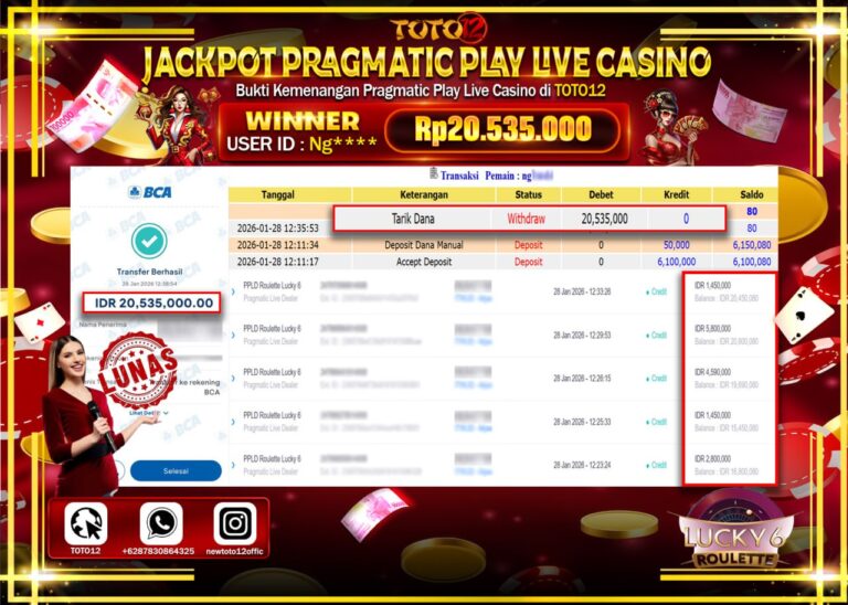Selamat kepada Member Kami Ng****** Telah Jackpot dan berhasil mendapatkan kemenangan besar pada permainan JACKPOT PRAGMATIC PLAY LIVE CASINO (ROULETTE LUCKY 6) Dengan Kemenangan Sebesar Rp.20.535.000 –. Setelah mengisi Fomulir Withdraw dengan Kurang waktu 1-2 Menit Dana sudah kami Trasnfer kepada Pemilik Userid dan dana sudah dapat di cairkan oleh pemenang. Bukti Pembayaran yang TOTO12 berikan…