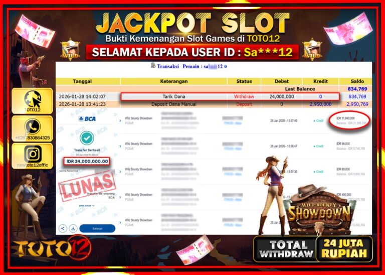 Selamat kepada Member Kami Sa****** Telah Jackpot dan berhasil mendapatkan kemenangan besar pada permainan JACKPOT SLOT GAME (WILD BOUNTY SHOWDOWN) Dengan Kemenangan Sebesar Rp.24.000.000 –. Setelah mengisi Fomulir Withdraw dengan Kurang waktu 1-2 Menit Dana sudah kami Trasnfer kepada Pemilik Userid dan dana sudah dapat di cairkan oleh pemenang. Bukti Pembayaran yang TOTO12 berikan merupakan Bukti…