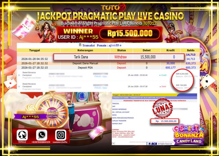 Selamat kepada Member Kami Aj****** Telah Jackpot dan berhasil mendapatkan kemenangan besar pada permainan JACKPOT PRAGMATIC PLAY LIVE CASINO (SWEET BONANZA CANDY LAND) Dengan Kemenangan Sebesar Rp.15.500.000 –. Setelah mengisi Fomulir Withdraw dengan Kurang waktu 1-2 Menit Dana sudah kami Trasnfer kepada Pemilik Userid dan dana sudah dapat di cairkan oleh pemenang. Bukti Pembayaran yang TOTO12…