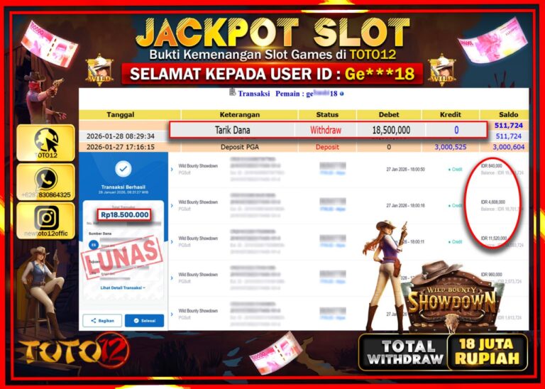 Selamat kepada Member Kami Ge****** Telah Jackpot dan berhasil mendapatkan kemenangan besar pada permainan JACKPOT SLOT GAME (WILD BOUNTY SHOWDOWN) Dengan Kemenangan Sebesar Rp.18.500.000 –. Setelah mengisi Fomulir Withdraw dengan Kurang waktu 1-2 Menit Dana sudah kami Trasnfer kepada Pemilik Userid dan dana sudah dapat di cairkan oleh pemenang. Bukti Pembayaran yang TOTO12 berikan merupakan Bukti…