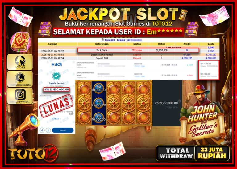 Selamat kepada Member Kami Em****** Telah Jackpot dan berhasil mendapatkan kemenangan besar pada permainan JACKPOT SLOT GAME (JOHN HUNTER AND GALILEOS SECRETS) Dengan Kemenangan Sebesar Rp.22.850.000 –. Setelah mengisi Fomulir Withdraw dengan Kurang waktu 1-2 Menit Dana sudah kami Trasnfer kepada Pemilik Userid dan dana sudah dapat di cairkan oleh pemenang. Bukti Pembayaran yang TOTO12 berikan…