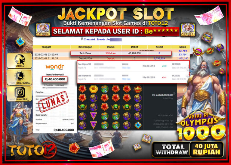 Selamat kepada Member Kami Be****** Telah Jackpot dan berhasil mendapatkan kemenangan besar pada permainan JACKPOT SLOT GAME (GATES OF OLYMPUS 1000) Dengan Kemenangan Sebesar Rp.40.000.000 –. Setelah mengisi Fomulir Withdraw dengan Kurang waktu 1-2 Menit Dana sudah kami Trasnfer kepada Pemilik Userid dan dana sudah dapat di cairkan oleh pemenang. Bukti Pembayaran yang TOTO12 berikan merupakan…