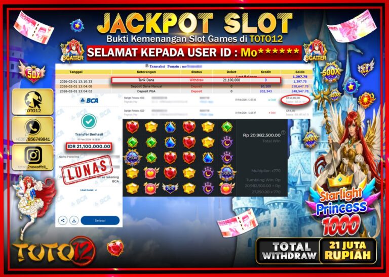 Selamat kepada Member Kami Mo****** Telah Jackpot dan berhasil mendapatkan kemenangan besar pada permainan JACKPOT SLOT GAME (STARLIGHT PRINCESS 1000) Dengan Kemenangan Sebesar Rp.21.100.000 –. Setelah mengisi Fomulir Withdraw dengan Kurang waktu 1-2 Menit Dana sudah kami Trasnfer kepada Pemilik Userid dan dana sudah dapat di cairkan oleh pemenang. Bukti Pembayaran yang TOTO12 berikan merupakan Bukti…
