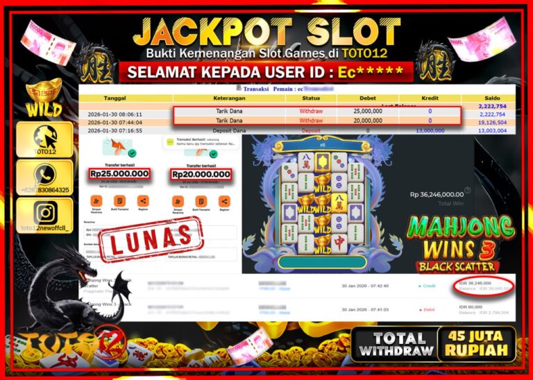 Selamat kepada Member Kami Ec****** Telah Jackpot dan berhasil mendapatkan kemenangan besar pada permainan JACKPOT SLOT GAME (MAHJONG WINS 3 BLACK SCATTER) Dengan Kemenangan Sebesar Rp.45.000.000 –. Setelah mengisi Fomulir Withdraw dengan Kurang waktu 1-2 Menit Dana sudah kami Trasnfer kepada Pemilik Userid dan dana sudah dapat di cairkan oleh pemenang. Bukti Pembayaran yang TOTO12 berikan…