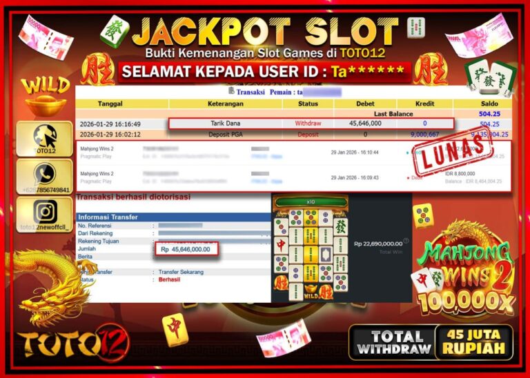 Selamat kepada Member Kami Ta****** Telah Jackpot dan berhasil mendapatkan kemenangan besar pada permainan JACKPOT SLOT GAME (MAHJONG WINS 2) Dengan Kemenangan Sebesar Rp.45.646.000 –. Setelah mengisi Fomulir Withdraw dengan Kurang waktu 1-2 Menit Dana sudah kami Trasnfer kepada Pemilik Userid dan dana sudah dapat di cairkan oleh pemenang. Bukti Pembayaran yang TOTO12 berikan merupakan Bukti…